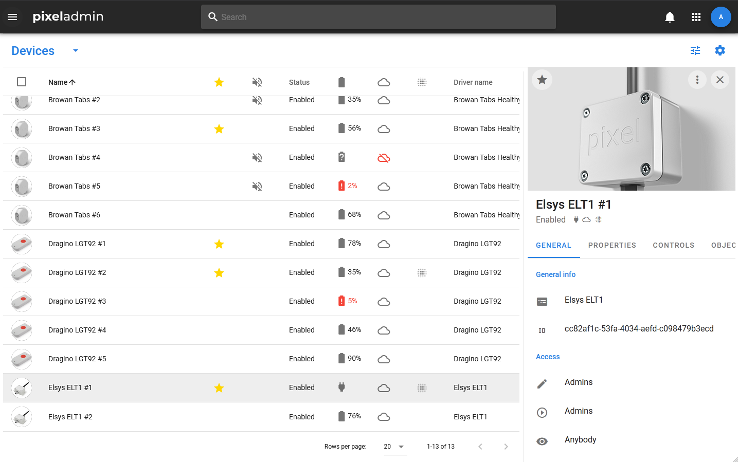 Basic information about the system elements, regardless of the selected section, is displayed in the table. Tables support sorting (in order to sort data by column, you need to click on its title) and pagination: at the bottom of the page there are buttons with which you can control the number of rows on the page and scroll through the pages. The total number of items is also displayed there.