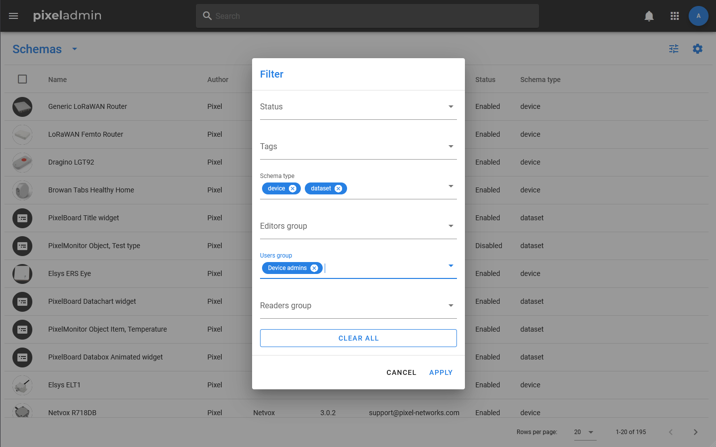 Filtering can be applied to all sections and allows you to leave only elements in the table that comply with certain rules. Rows in which objects do not meet the filtering conditions are hidden.