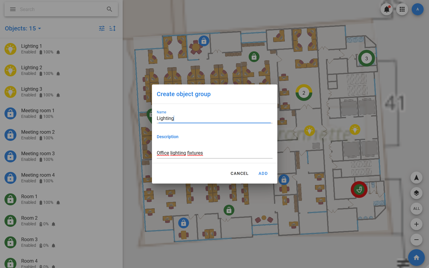 In PixelMonitor, there is such a thing as groups of objects: groups are displayed in the menu and when you select a group in the list and on the map, only those objects that are part of it are displayed. Also, a plan can be linked to the group, then it will be displayed when you select the group.