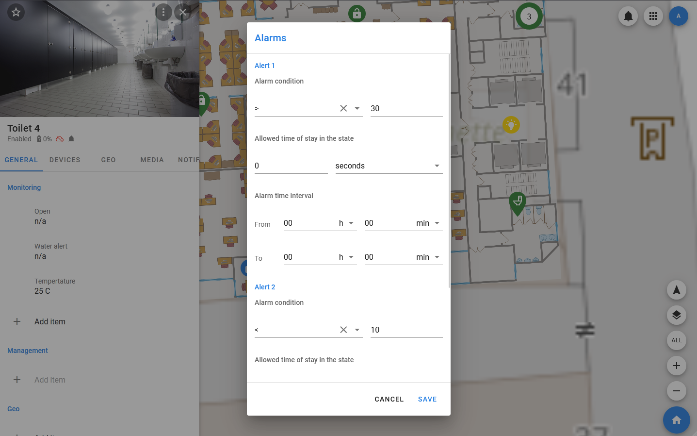 - Allowed time of stay in the state — the time during which the condition must be met for the alarm to be triggered. The default value is zero.